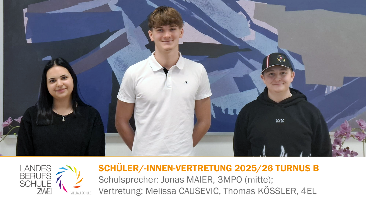 Die Wahl der Schülervertretung erfolgt in den ersten Tagen des jeweiligen Turnus. Die gewählten Schülervertreter*innen werden unmittelbar darauf immer hier sowie auf unserer Facebook-Seite (https://www.facebook.com/LBS2.Salzburg) präsentiert.